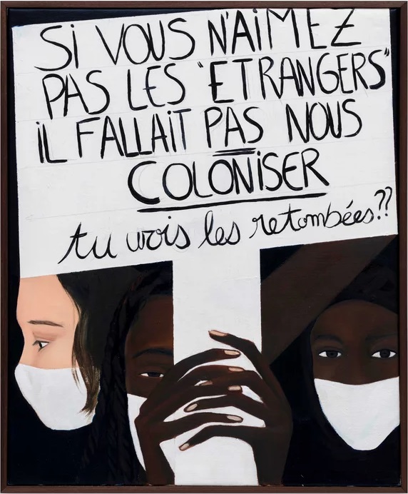Quant à moi, parmi toutes ses œuvres présentées, j’ai eu une attention très particulière, car intime, pour son tableau peint en 2022 : « SI VOUS N’AIMEZ PAS LES « ÉTRANGERS » IL FALLAIT PAS NOUS COLONISER tu vois les retombées ??«